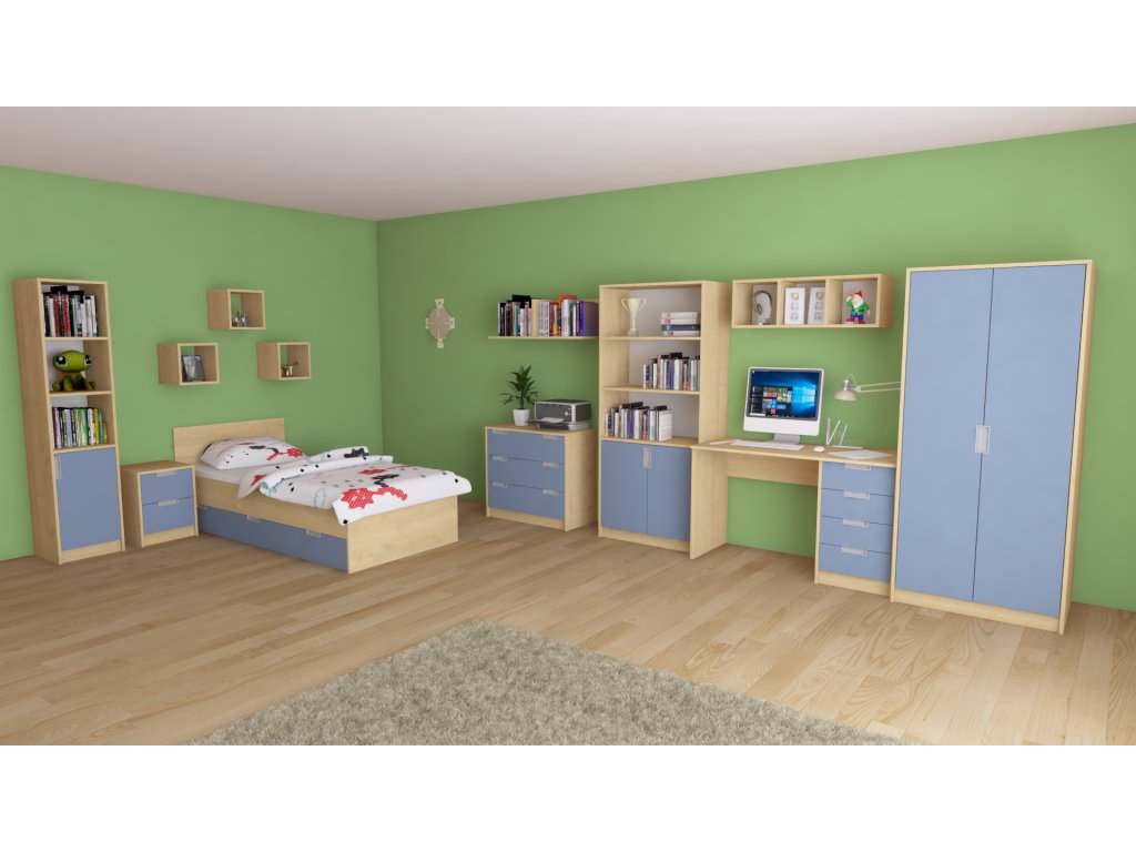 Komoda do dětského pokoje, šířka komody je 80 cm, hloubka 45 cm a výška komody je 76 cm. K základní výbavě skříně patří 4 kluzáky...