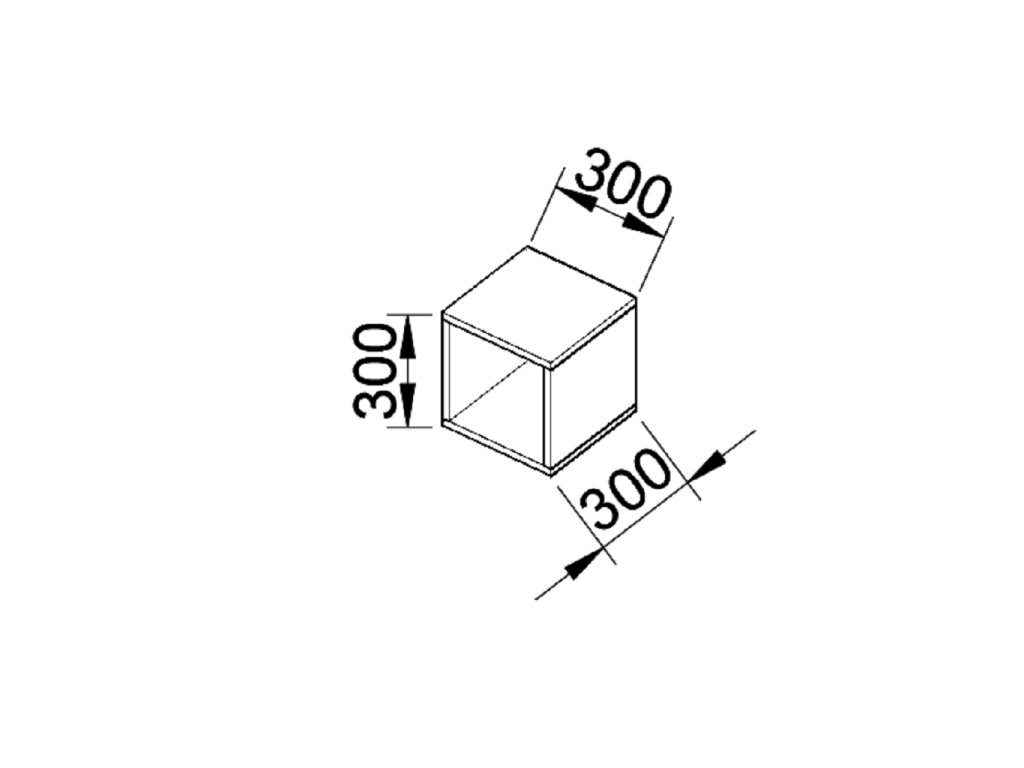 Police krychle, šířka, hloubka a výška jsou 30 cm. Police je z desky o tloušťce 18 mm. Všechny boční plochy jsou hraněny ABS hranou o tloušťce 0,5 mm.