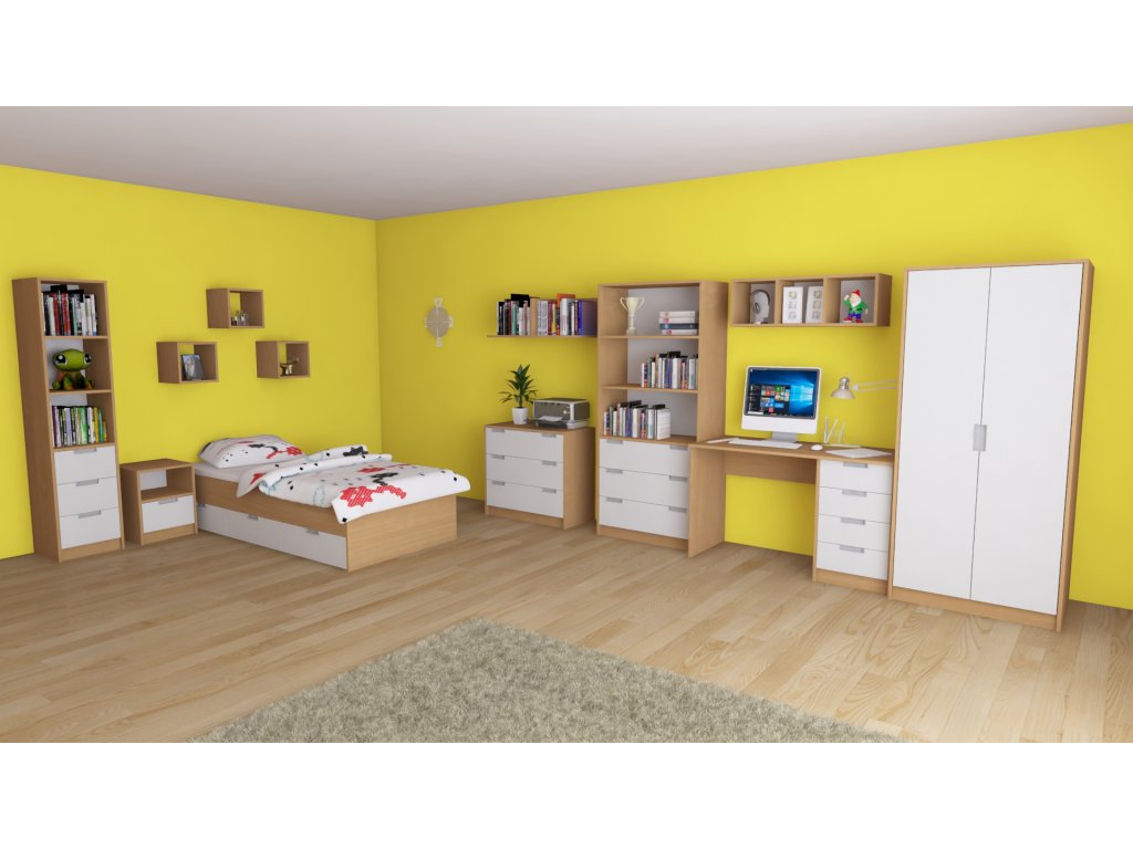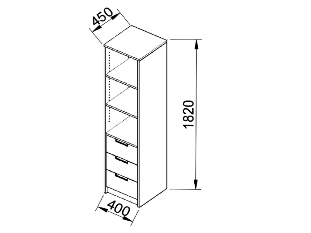 Policová skříň do dětského pokoje, šířka skříně je 40 cm, hloubka je 45 cm a výška skříně 182 cm. K základní výbavě skříně patří 4 kluzáky s možností výškového nastavení v případě nerovné podlahy v dětském pokoji a zápustné úchytky, které jsou pro děti bezpečnější než úchytky klasické.