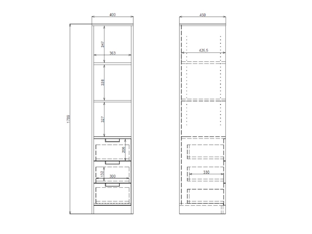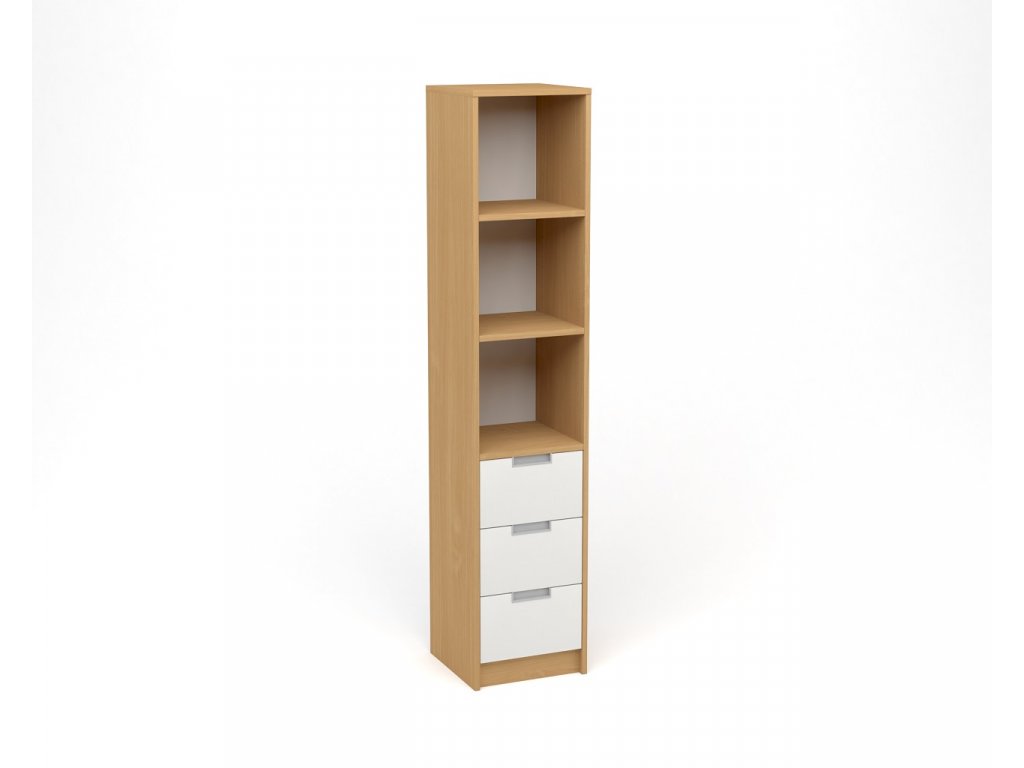 Policová skříň úzká, zásuvky s nikou Buk Bílá