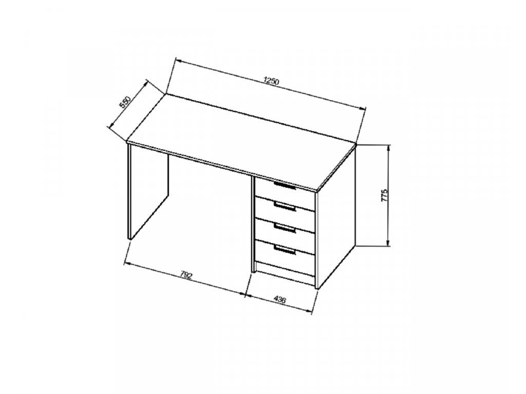 Psací stůl do dětského pokoje, šířka stolu je 125 cm, hloubka je 55 cm a výška stolu 77,5 cm. Dřevěná podnož má možnost rektifikace, což umožňuje vyrovnání nerovné podlahy v dětském pokoji. Čela zásuvek jsou opatřena zápustnými úchytkami, které jsou pro děti bezpečnější než úchytky klasické.