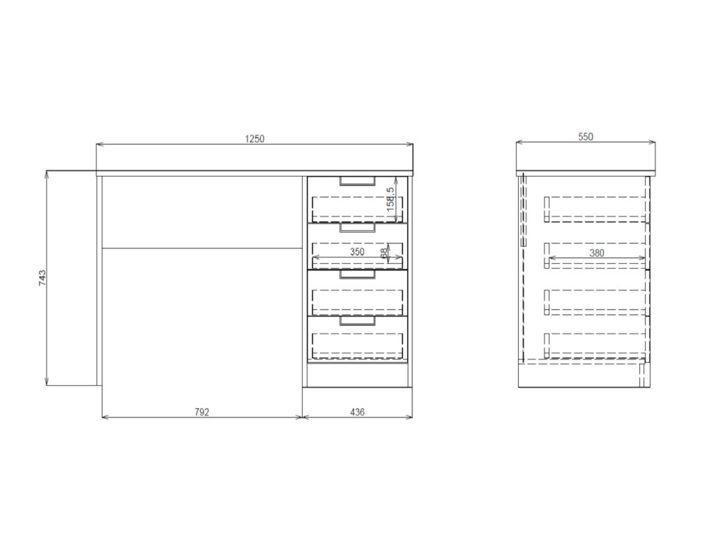 Deska stolu je vyrobena z desky o síle 18 mm a je ohraněna ABS hranou tloušťky 2 mm. Boky a dno tvoří deska o síle 18 mm čelně ohraněná ABS hranou 2 mm, ostatní boční plochy jsou ohraněny ABS hranou 0,5 mm. Čela zásuvek jsou také z desky o síle 18 mm a jsou celá ohraněna ABS hranou tloušťky 2 mm. Soklová lišta je také tloušťky 18 mm. Záda stolové skříňky jsou vyrobena z bílého sololaku o síle 3 mm.