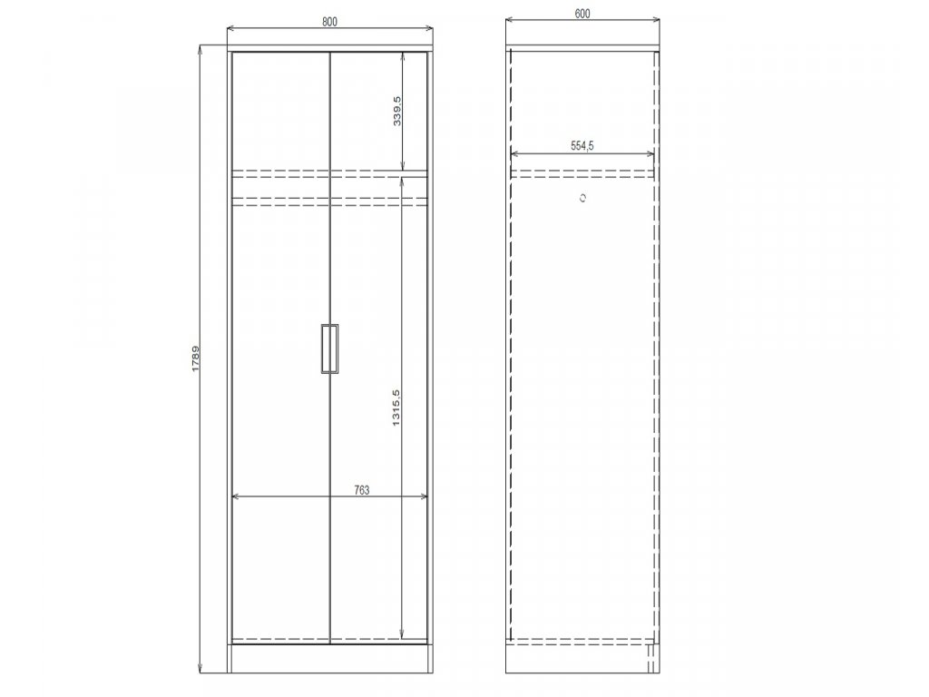 Vnitřní rozvržení skříně tvoří police, umístěná v horní části skříně a šatní tyč. Panty dveří jsou doplněny tlumičem pro tlumení dveří při zavírání.
